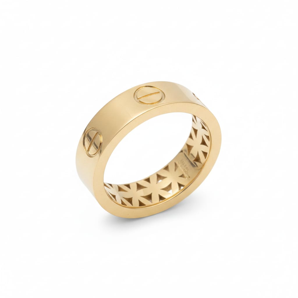 טבעת זהב 14K יוקרתית בעיצוב על‑זמני בהשראת Cartier, המשלבת אלגנטיות קלאסית עם נוכחות מודרנית. החישוק מעוטר במוטיב ברגים אייקוני המעניק לטבעת מראה יוקרתי ומובחן, בעוד שהגימור המבריק מדגיש את עומק הזהב ואת איכות העבודה. בחלק הפנימי של הטבעת מחכה הפתעה ייחודית—חריטת כוכבים גיאומטרית המוסיפה טאץ' אישי ומלא אופי.