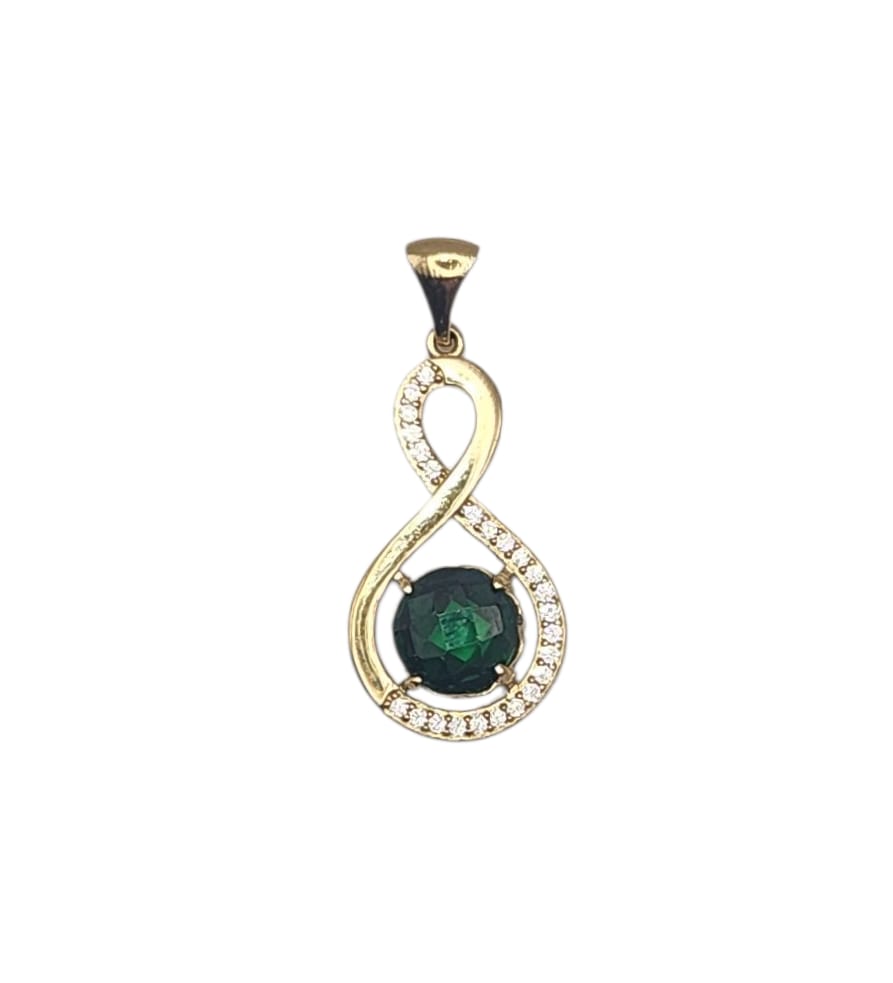 תליון אינפינטי בזהב צהוב 14K עם אבני זירקון לבנים משובצים בצד אחד עם אבן ירוקה על התכשיט