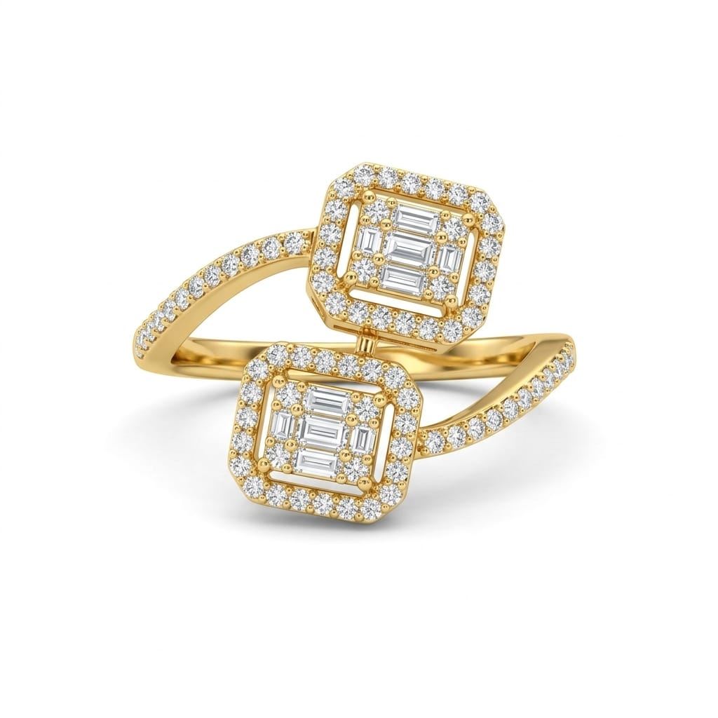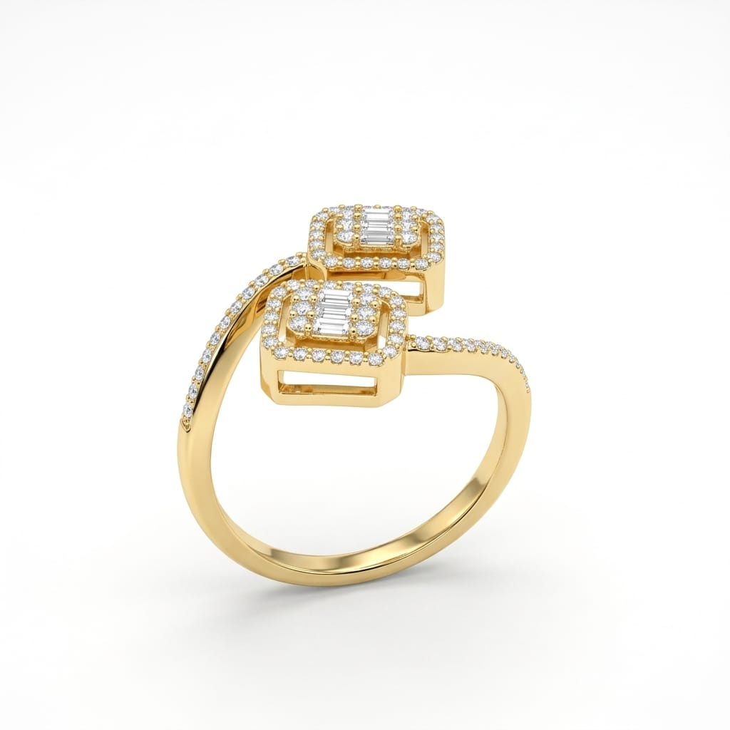 בנוסף, משובצים 6 יהלומי בגט במשקל 0.12 קראט, המעניקים לטבעת מראה גיאומטרי יוקרתי ומודרני. שילוב החיתוכים, הניקיון הגבוה והעיצוב הא-סימטרי יוצר תכשיט מרשים, יוקרתי ומלא אופי — מושלם כטבעת סטייטמנט או כמתנה בלתי נשכחת.