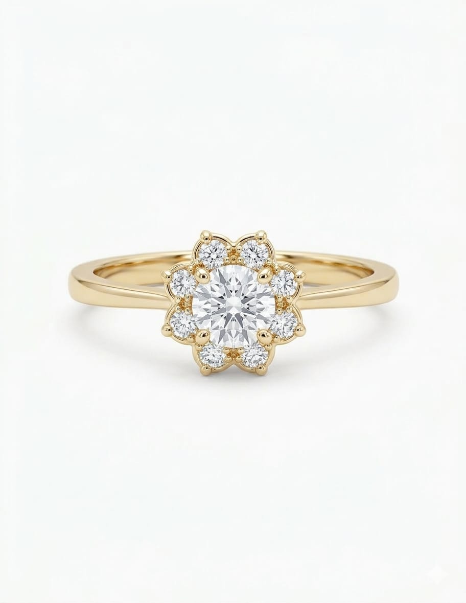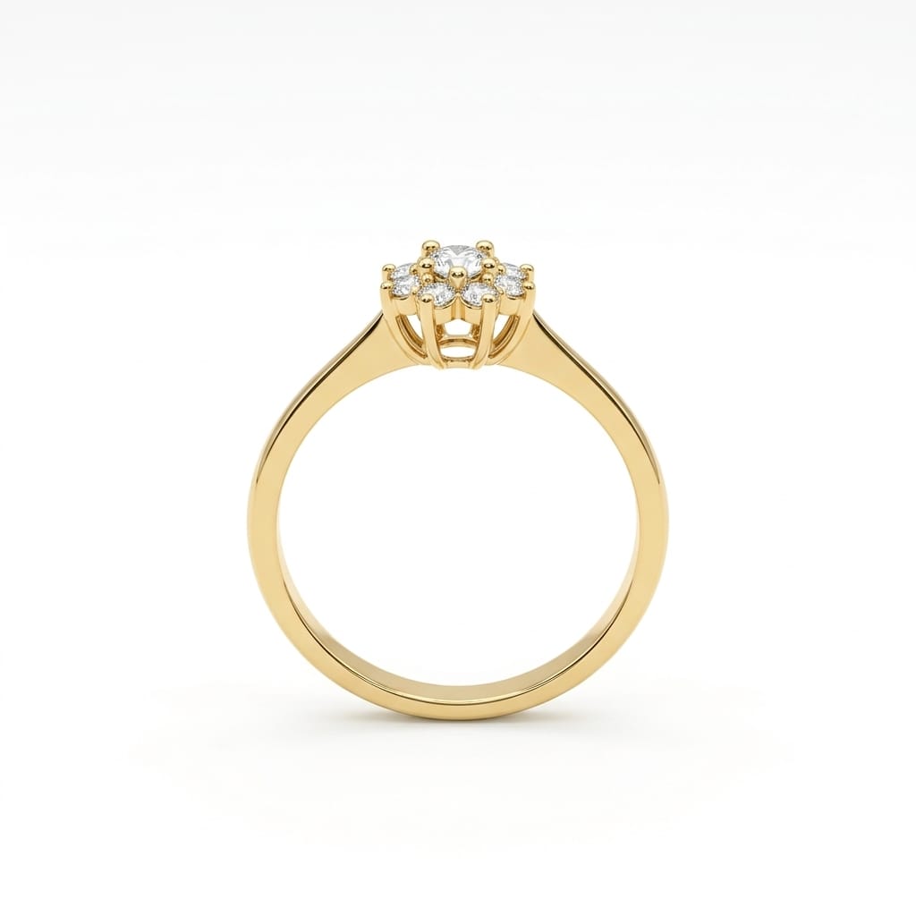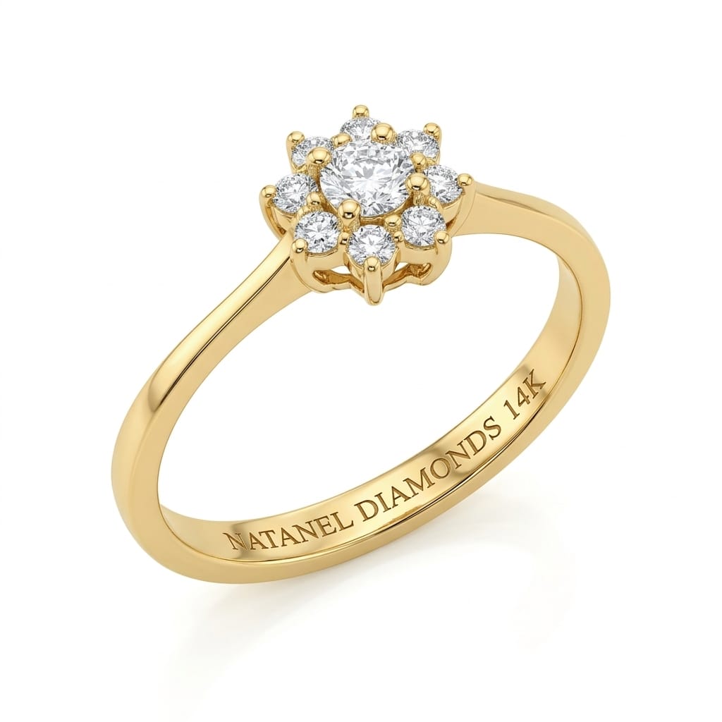 עם משקל כולל של 0.31 קראט, היהלומים מסודרים בצורה היוצרת אפקט פריחה זוהר, המפיץ ברק עוצמתי מכל זווית. החישוק המוזהב והמלוטש מדגיש את הניצוץ הטבעי של היהלומים ומעניק לטבעת מראה יוקרתי, נקי ומלא נוכחות.