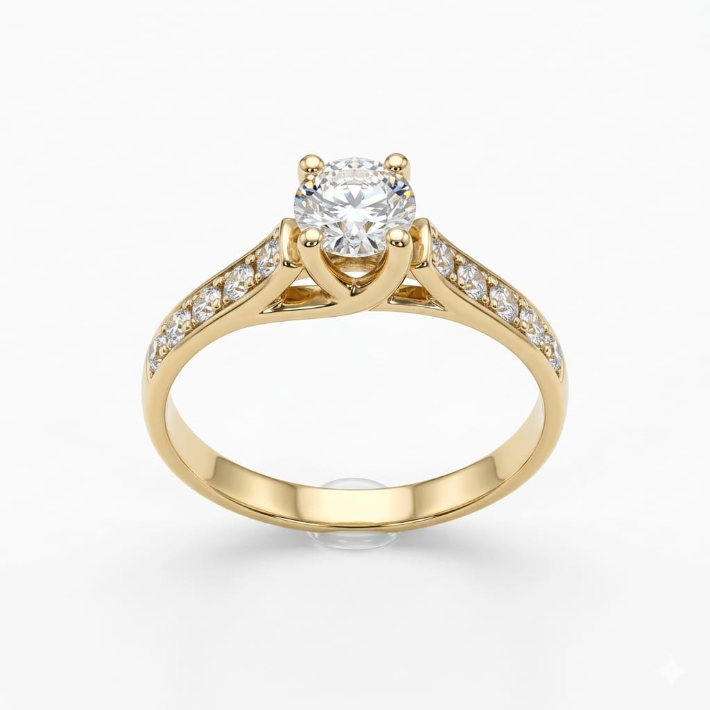 טבעת אירוסין זו עשויה זהב 14K מלא ומציגה במרכזה יהלום טבעי 0.55 קראט בדרגת צבע G וניקיון SI, המעניקים לו ברק מרשים ונוכחות יוקרתית. לצידי היהלום המרכזי משובצים 10 יהלומי צד טבעיים במשקל כולל של 0.30 קראט, בדרגת F/VS, המוסיפים ניצוץ עדין ומרשים לאורך הזרועות.