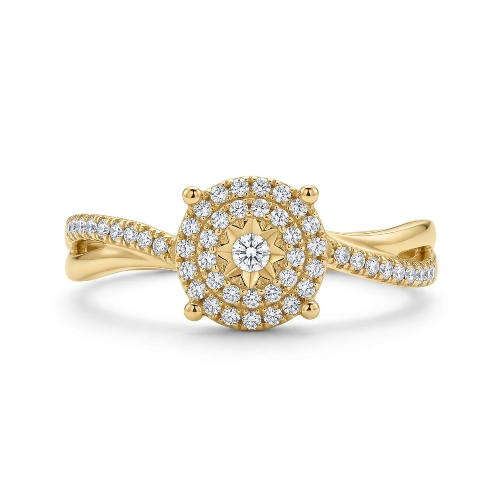 במרכז הטבעת ניצב אשכול יהלומים עגול, המוקף בשתי הילות נוצצות היוצרות מראה פרחוני אלגנטי ומלא חיים. יהלומים נוספים משובצים לאורך החישוק, ומעניקים לטבעת נוכחות יוקרתית ועוצמתית.