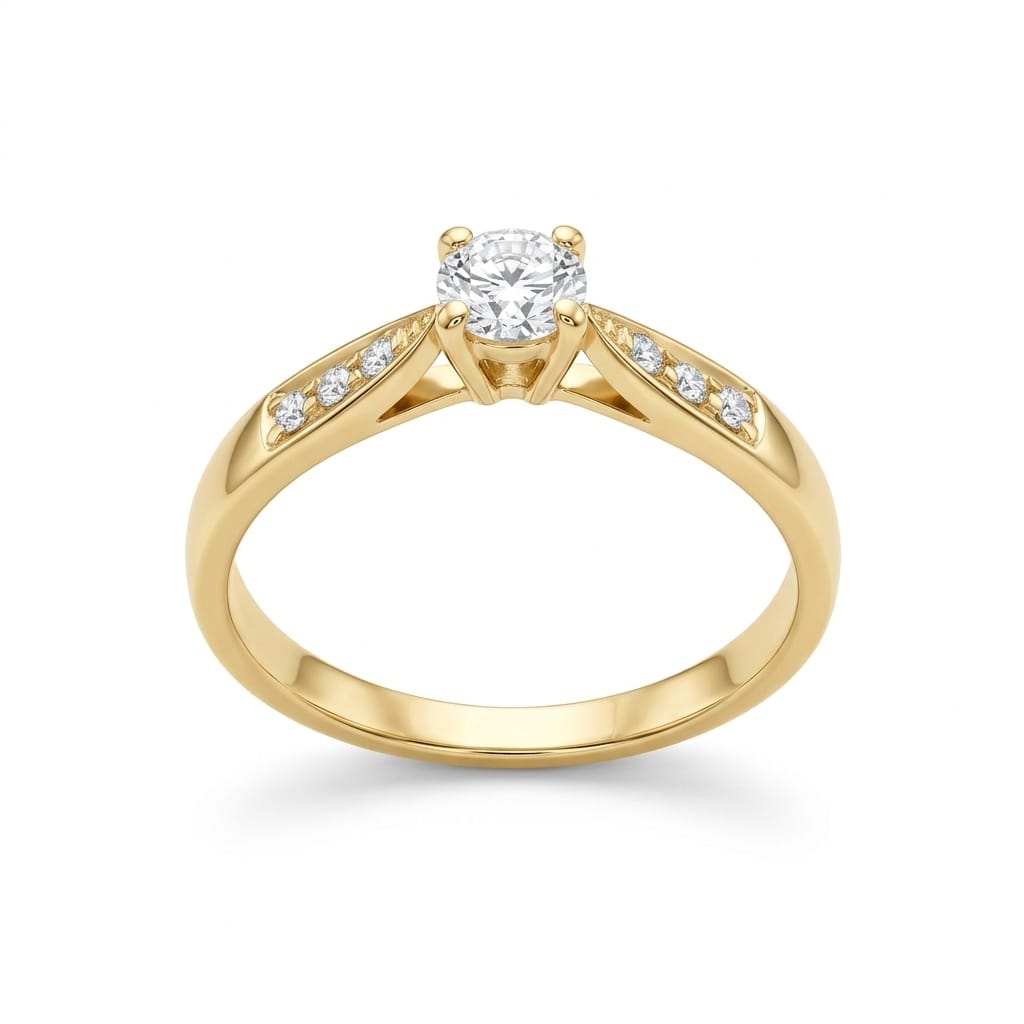 טבעת יהלומים זו עשויה זהב 14K מלא ומציגה במרכזה יהלום טבעי 0.25 קראט בדרגת צבע G וניקיון SI, שנבחר בקפידה בזכות הברק הטהור והנוכחות האלגנטית שלו. לצידי היהלום המרכזי משובצים שישה יהלומי צד טבעיים במשקל כולל של 0.10 קראט, בדרגת F/VS, המוסיפים ניצוץ יוקרתי ומדגישים את קווי העיצוב הנקיים.