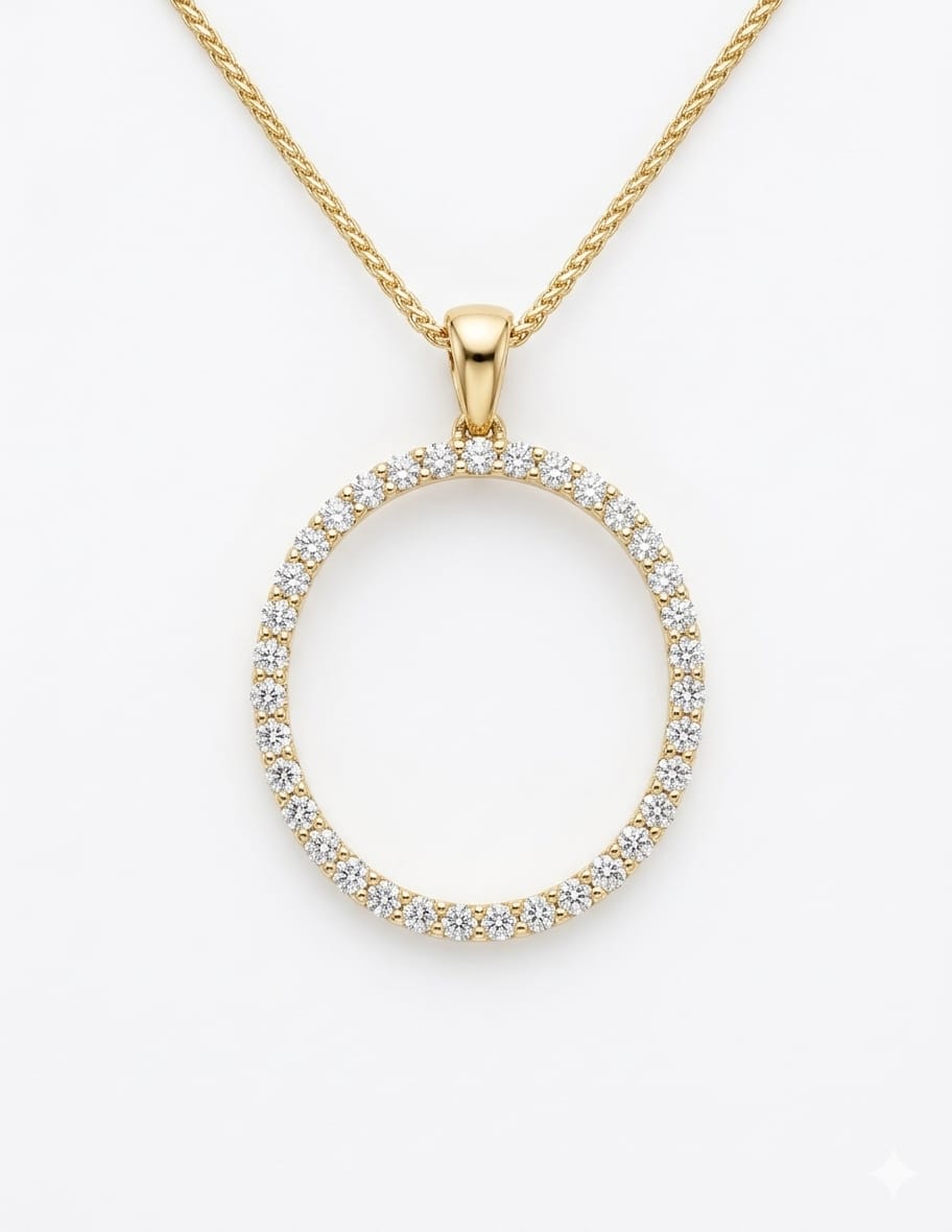 This stunning 14K gold diamond circle pendant features a classic open‑circle design fully encrusted with high‑quality diamonds. The clean, modern silhouette combined with exceptional sparkle makes this piece perfect for both everyday elegance and special occasions. A timeless symbol of unity, wholeness, and sophistication.