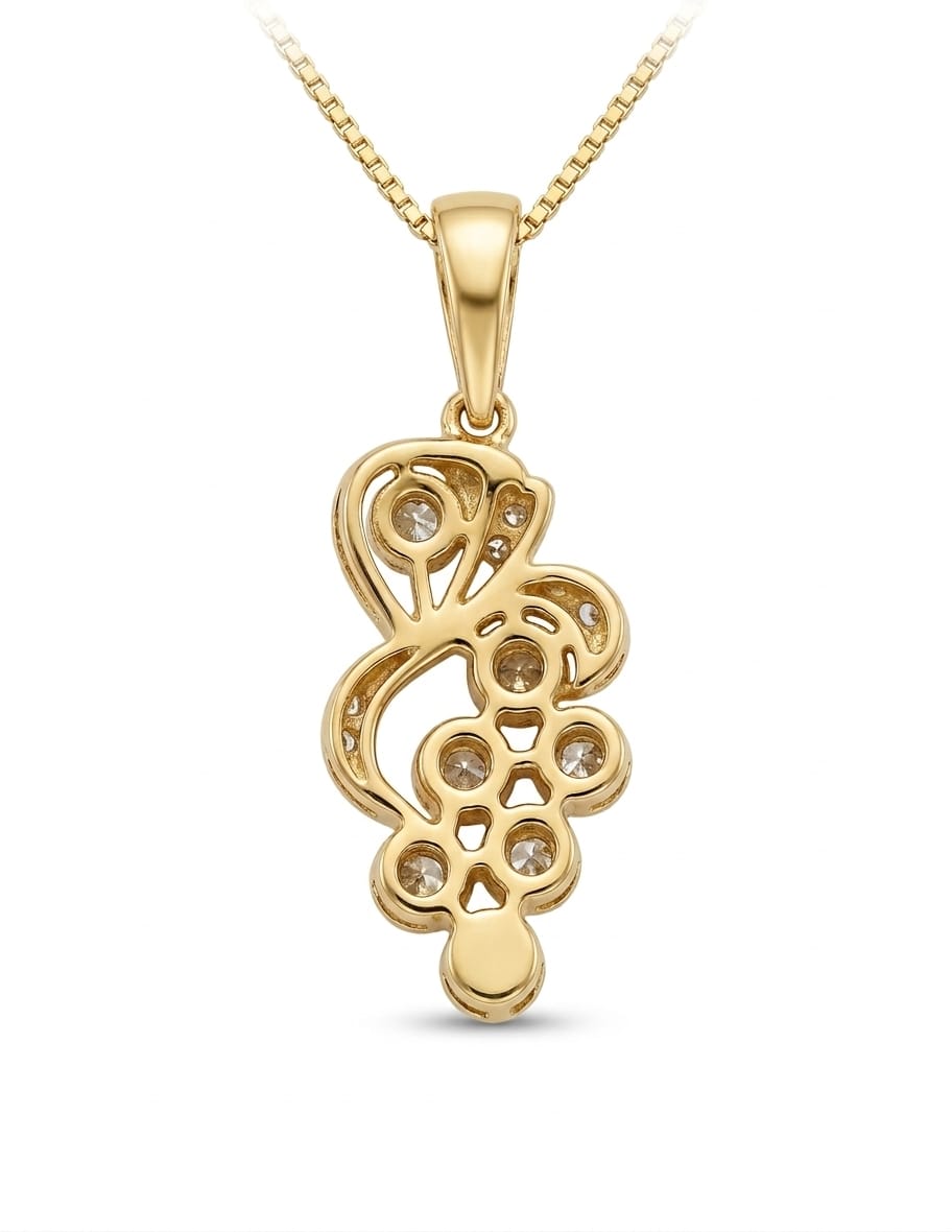 This exquisite 14K gold diamond pendant showcases a beautifully sculpted cluster motif made of interlocking gold loops, creating a refined floral‑like silhouette. Each curve is adorned with high‑quality diamonds, adding brilliance and sophistication to the piece.