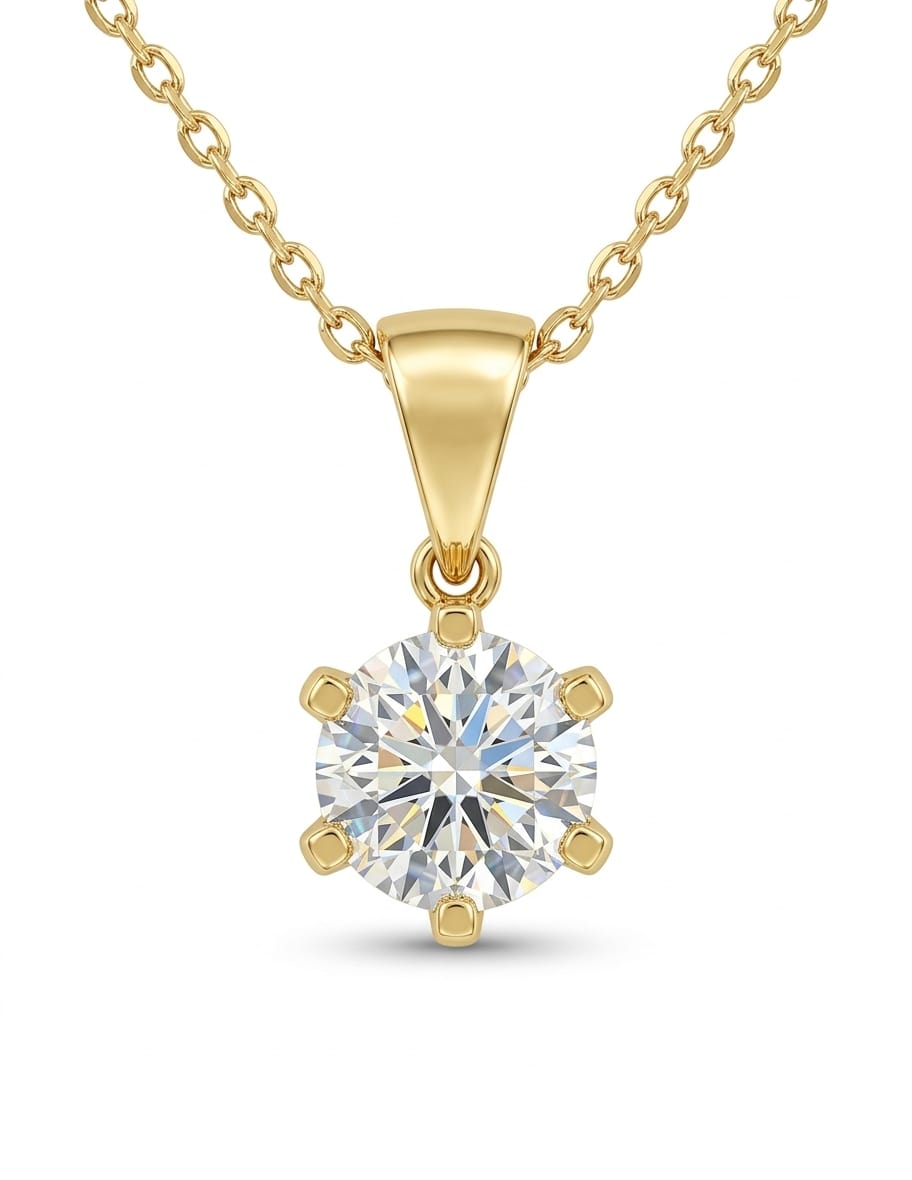 This exquisite 14K gold solitaire diamond pendant showcases a stunning round‑cut diamond secured in a refined six‑prong setting. The design maximizes light reflection, giving the diamond exceptional brilliance and fire. A perfect blend of simplicity and luxury, ideal for both everyday wear and special occasions.