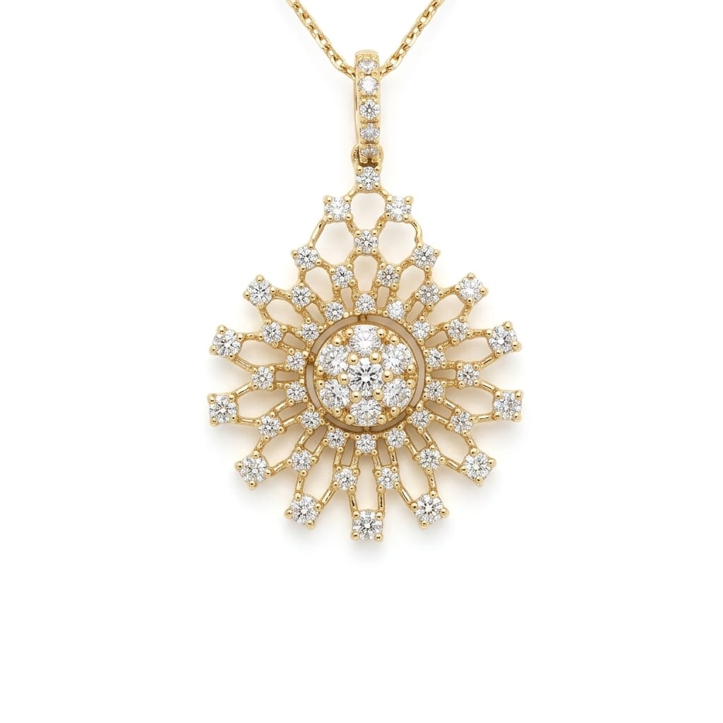 This exquisite sunburst‑style pendant is crafted from premium 14K gold and adorned with 55 high‑quality CVD diamonds. Its radiant, symmetrical design creates a brilliant sparkle, making it a standout piece for any jewelry collection.