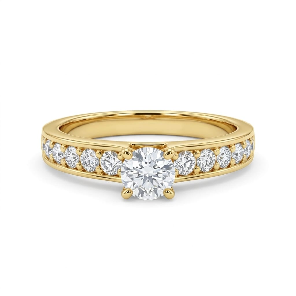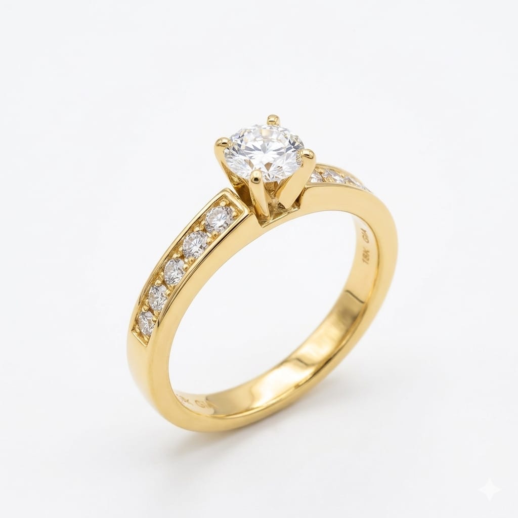 Encircling the center stone are 14 natural accent diamonds, totaling 0.24ct, all in G color and VS clarity. Together, they create a radiant halo that enhances the presence and luminosity of the main diamond. The polished 18K gold band adds richness and durability, completing the ring’s luxurious aesthetic.