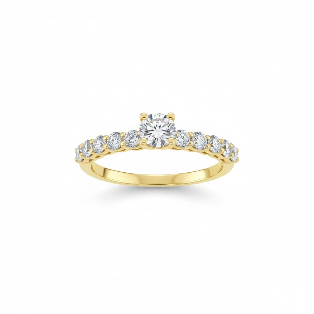 18K Gold Ring set with 1 central natural diamond (0.34ct, F/VS) and 10 side diamonds (0.55ct total, F/VS). Total 0.89ct.