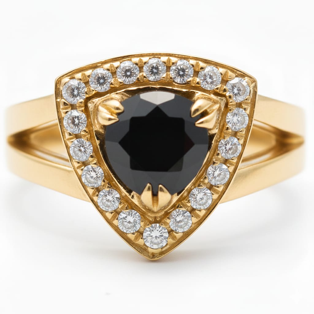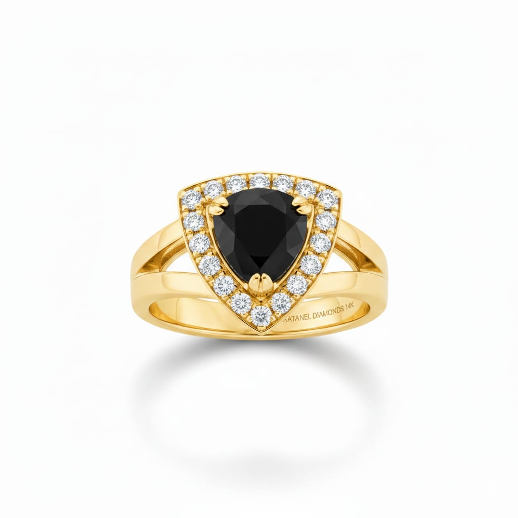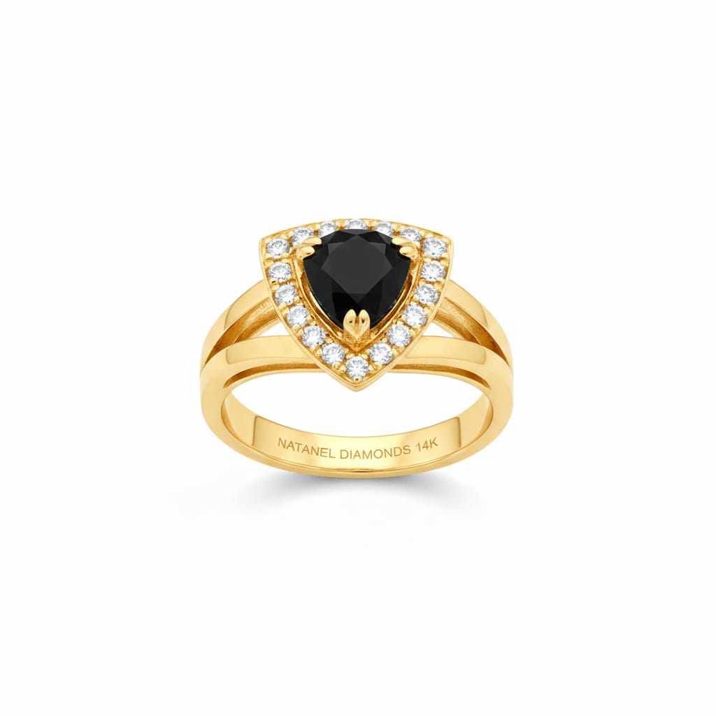 A bold 14K gold ring featuring a striking black diamond centerpiece, surrounded by 19 sparkling natural diamonds (0.28ct) for a look that radiates modern luxury.
