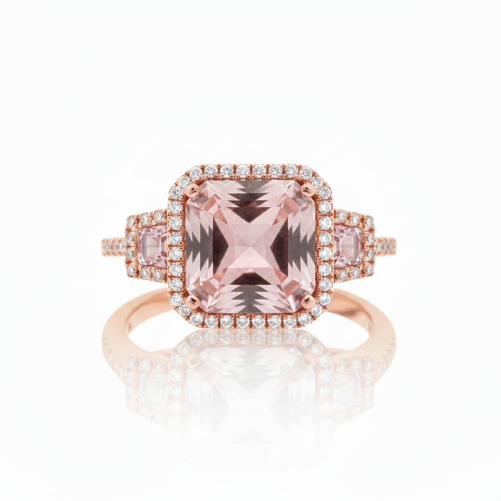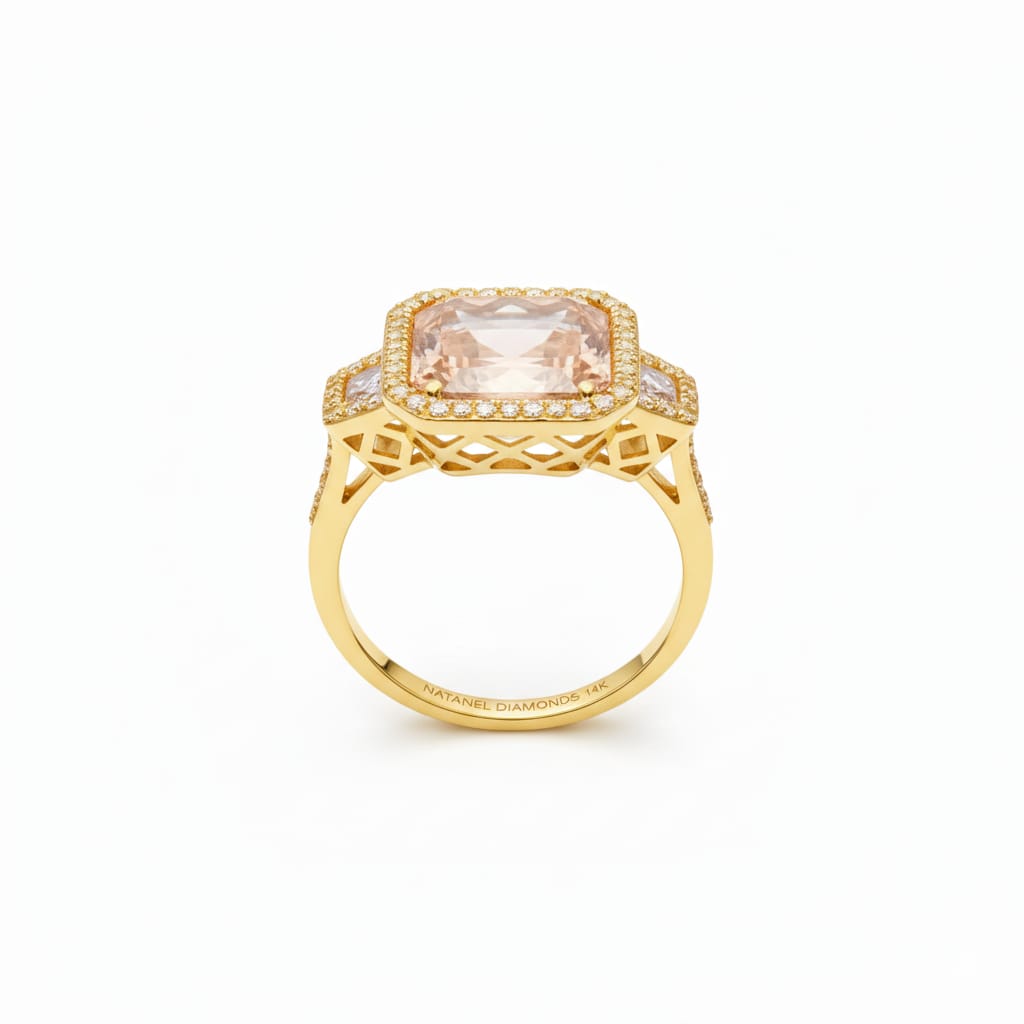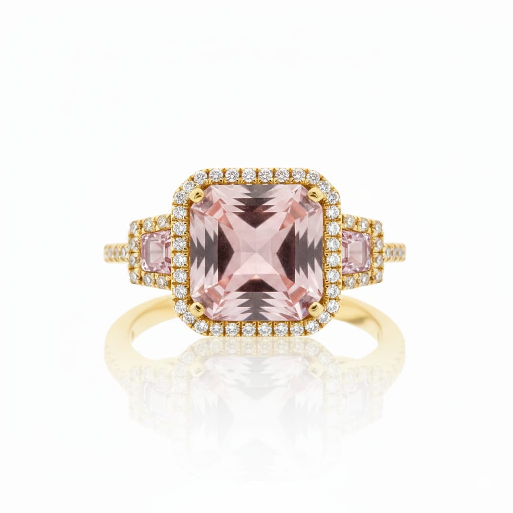 Material: 14K Yellow Gold Main Stone: Square-cut pink gemstone Accent Stones: