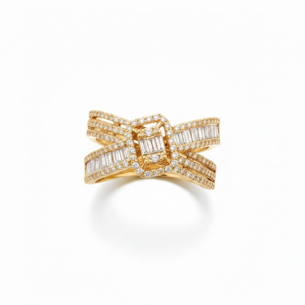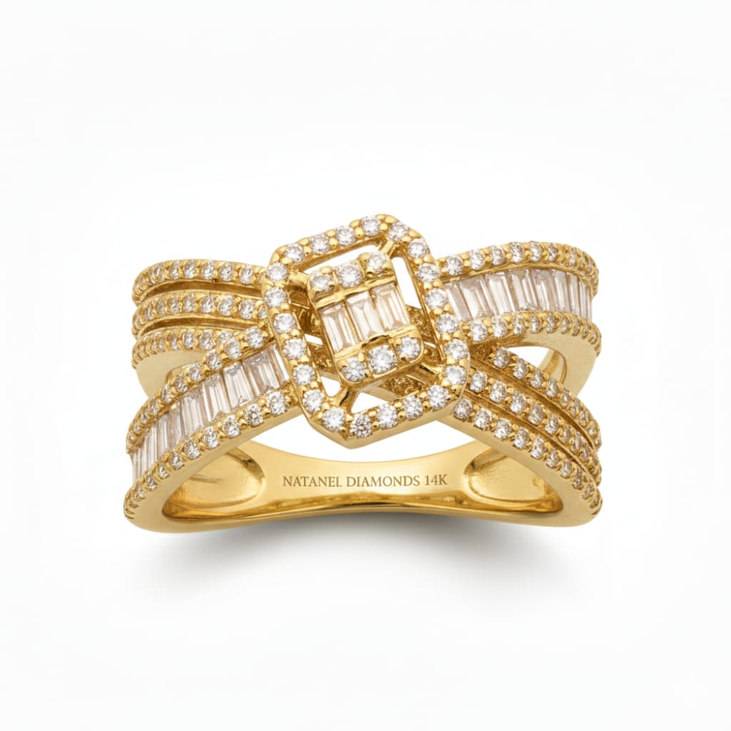 The sculpted, multi‑row band wraps gracefully around the finger, forming an architectural silhouette that feels both bold and refined. Each baguette diamond is set with precision to enhance the ring’s clean lines, while the round diamonds add a continuous shimmer that elevates the design to a new level of radiance. Together, they create a dynamic, luxurious texture that sparkles with every movement.